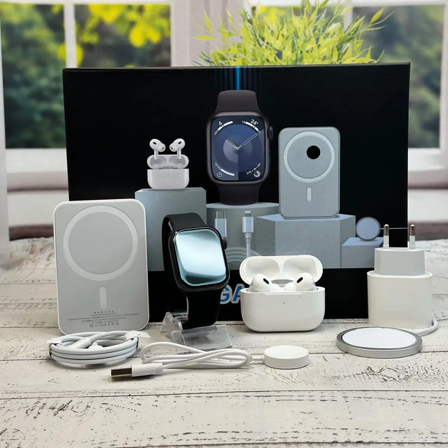 Набір комплект Megabox 6в1: Smart Watch 9, навушники Air Pro 2, павербанк, блок живлення, чорний.