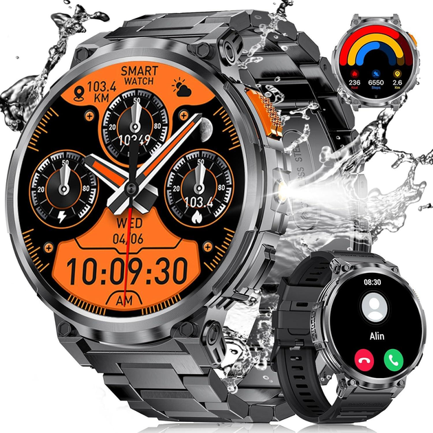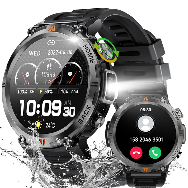 Військовий смарт-годинник для чоловіків зі світлодіодним ліхтариком (дзвінок/відповідь через Bluetooth), водонепроникний 3AT