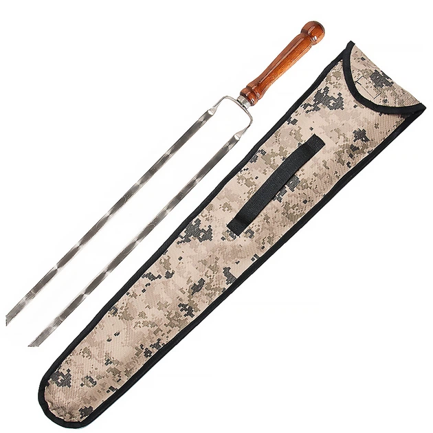 Шампур подвійний 640 мм для курки великих порцій м'яса нержавіюча сталь 3 мм дерев'яна ручка з чохлом