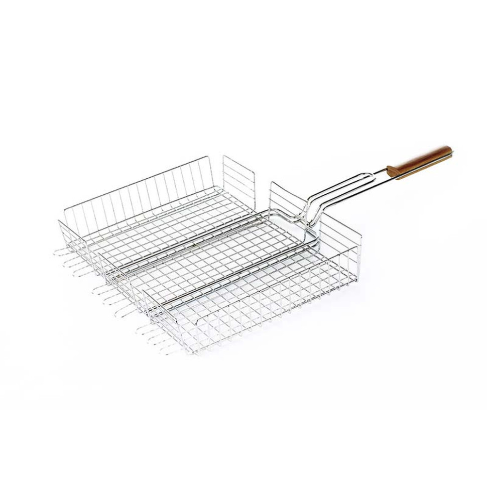 Решетка для гриля Kamille изготовлена из прочной стали. Главными преимуществами решетки для гриля являются разъемный механизм и высокий бортик, позволяющие обжаривать даже толстые куски мяса или рыбы, запекать курицу целиком.