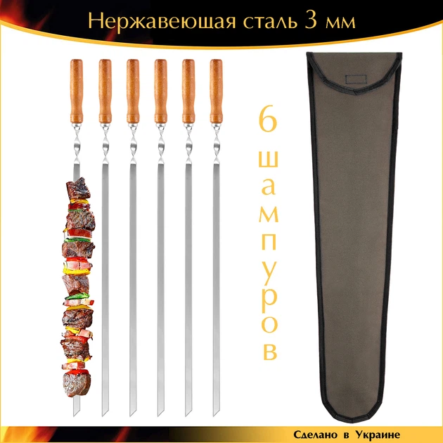 Шампура 650/10/3мм 6 штук нержавіюча сталь дерев'яна ручка Ручна Робота в наборі з чохлом EcoGrill