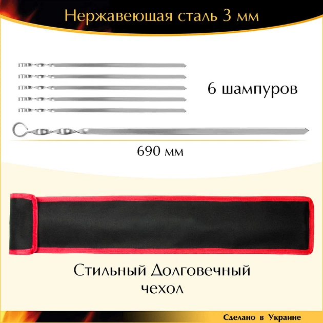Набор шампуров 690/15/3мм 6 шт нержавеющая сталь с чехлом