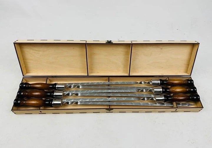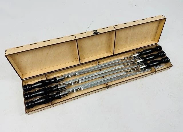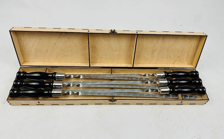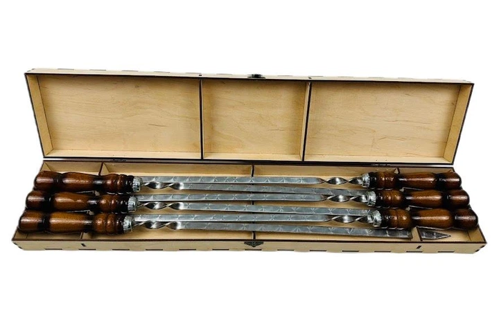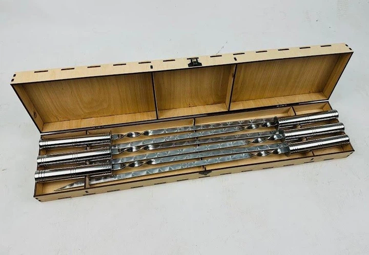 Набір шампурів Вуд з нержавіючої сталі з дерев'яною ручкою в кейсі з фанери 6 шт Коричневий (142-10-NB-3001-K)