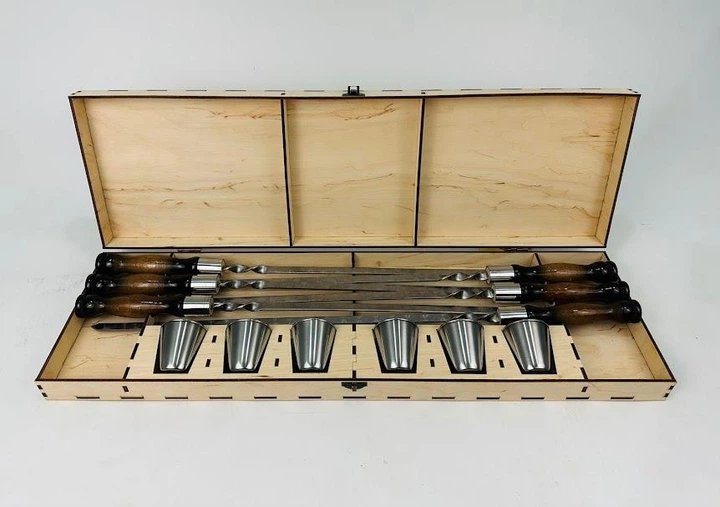 Набір шампурів Вуд з нержавіючої сталі в кейсі з фанери та чарками на 12 предметів Натуральний (135-10-NB-3003)