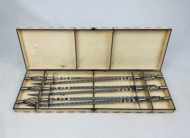 Набір шампурів Вуд з нержавіючої сталі з фігурною ручкою 6 шт в кейсі з фанери Срібний (142-10-NB-3009)
