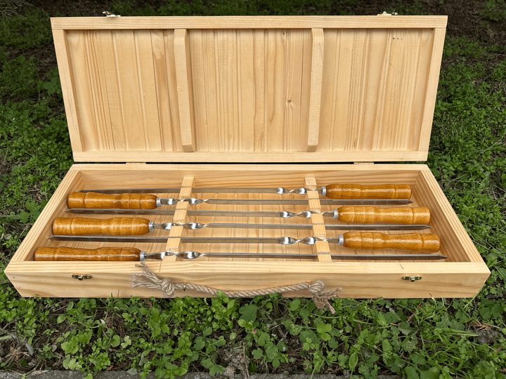 Подарунковий набір шампурів для шашлику з дерев'яною ручкою в дерев'яному кейсі, комплект із 6 штук-довжиною 62,7 см