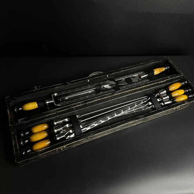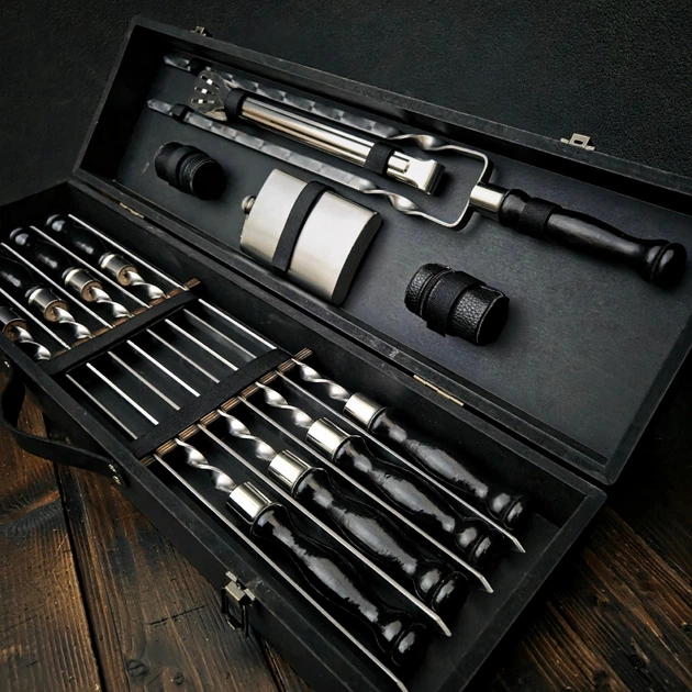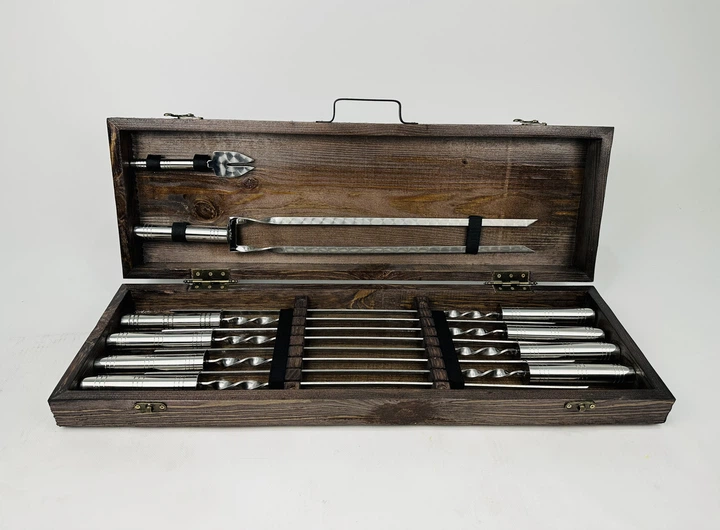 Набір з 6 шампурів для м'яса (600х10х3 мм) + комплект аксесуарів у дерев'яному кейсі Ш10