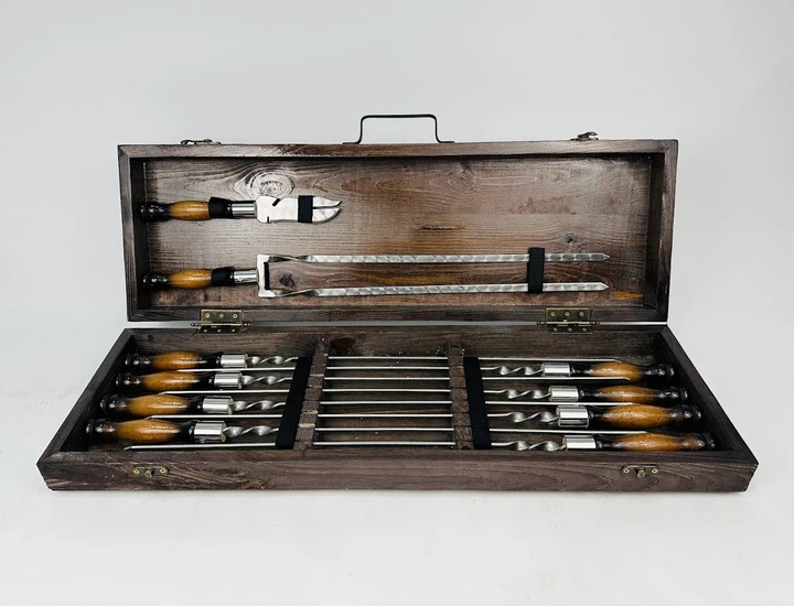 Набір із 6 шампурів для м'яса (630х10х3 мм) + комплект аксесуарів у дерев'яному кейсі Ш60