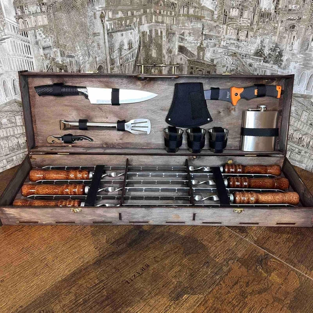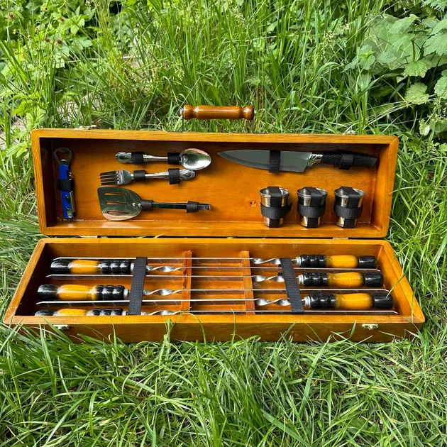 Набір шампурів Вогонь і Сталь в дерев'яному кейсі Подарунковий набір для пікніка (KS-7611)
