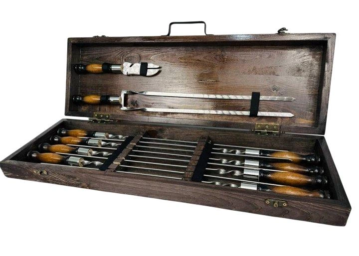 Набір шампурів у дерев'яному кейсі Преміум маленький з нержавіючої сталі 10 предметів (80-10- KS-7612)