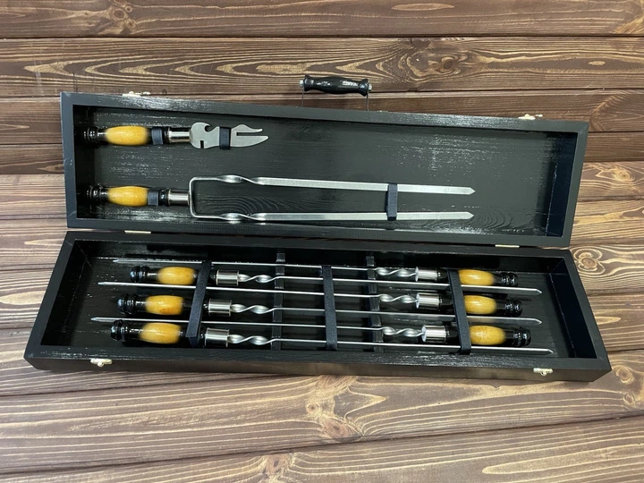 Набір із 6 шампурів для м'яса (630х10х3 мм) + комплект аксесуарів у дерев'яному кейсі Ш61