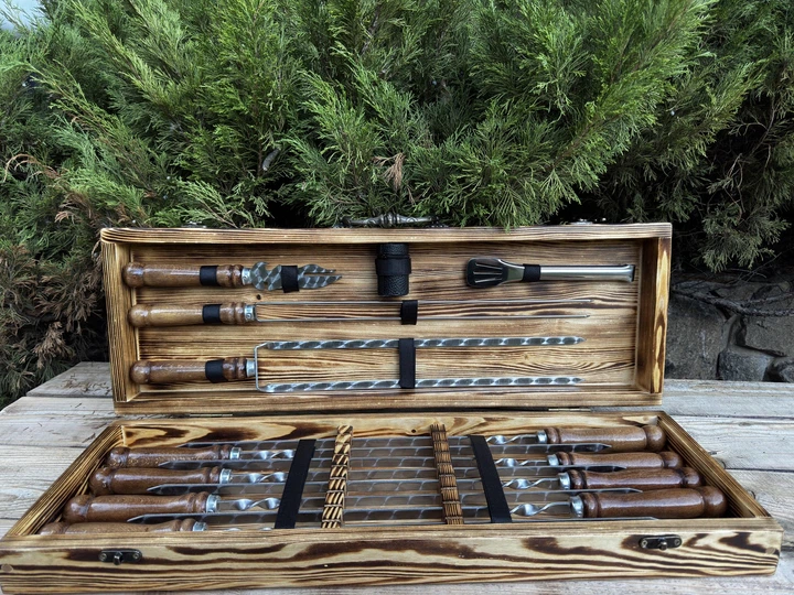 Набір із 6 шампурів для м'яса (600х10х3 мм) + комплект аксесуарів у дерев'яному кейсі Ш25