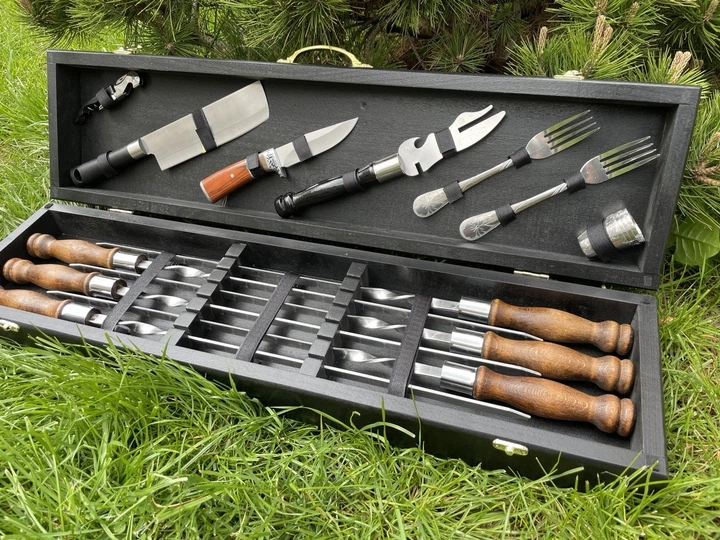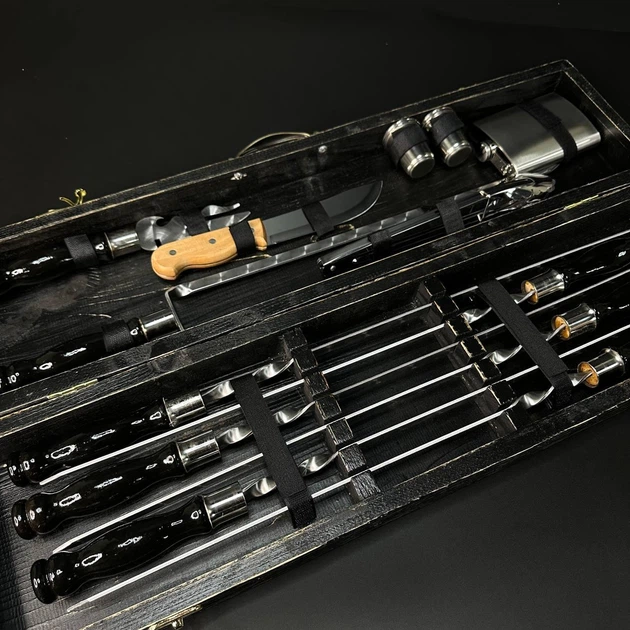 Набір 6 шампурів 600х10х3 + набір аксесуарів у дерев'яному кейсі (650х23х10 мм)