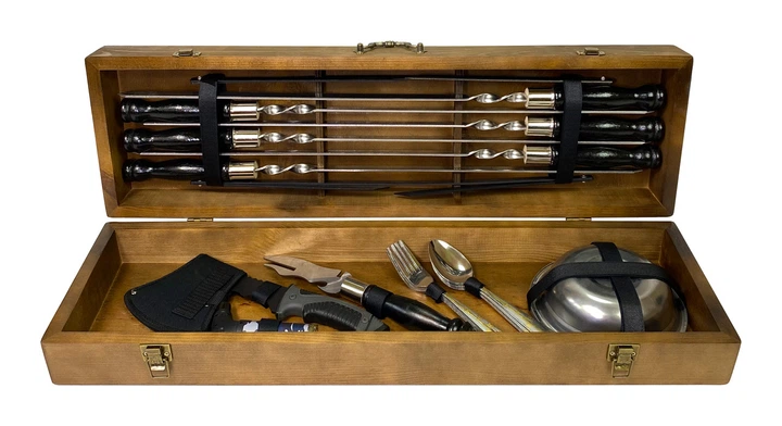 Набір з 6 шампурів + комплект аксесуарів у дерев'яному кейсі k-017