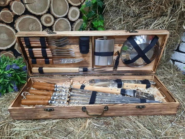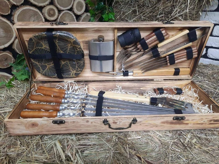 Набір із 6 шампурів для м'яса (630х12х3 мм) + комплект аксесуарів у дерев'яному кейсі e-002