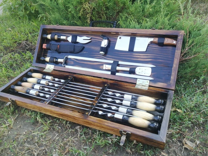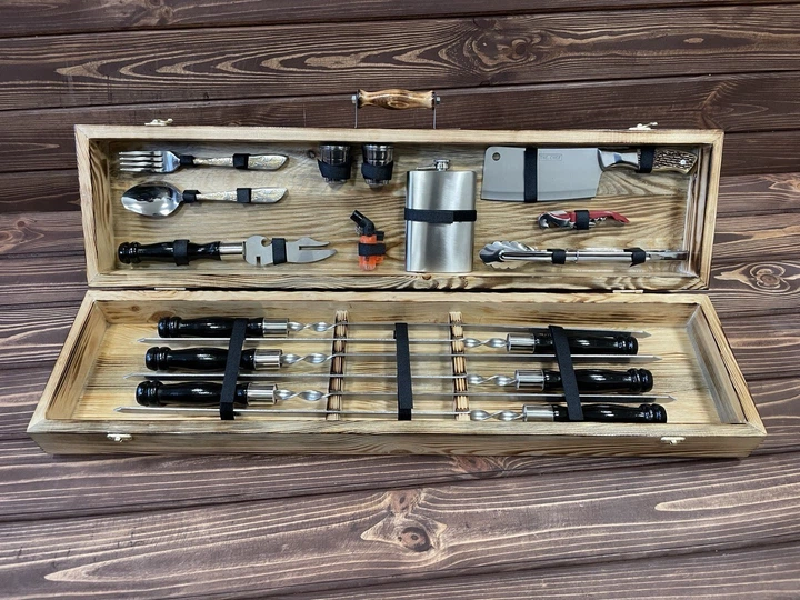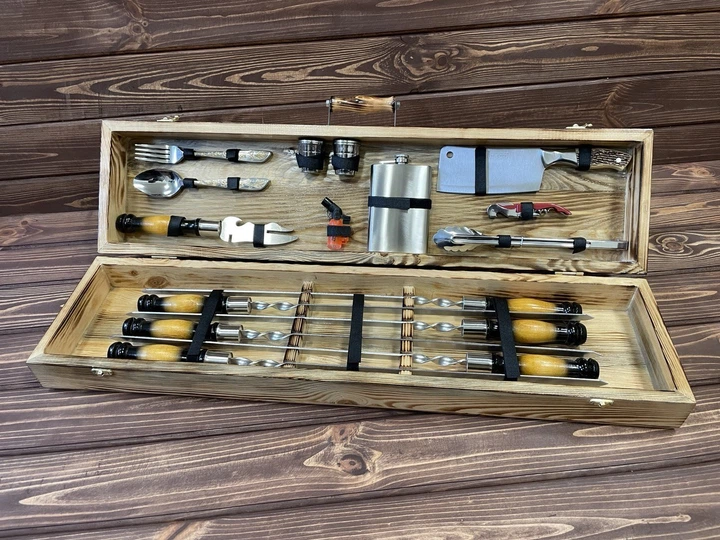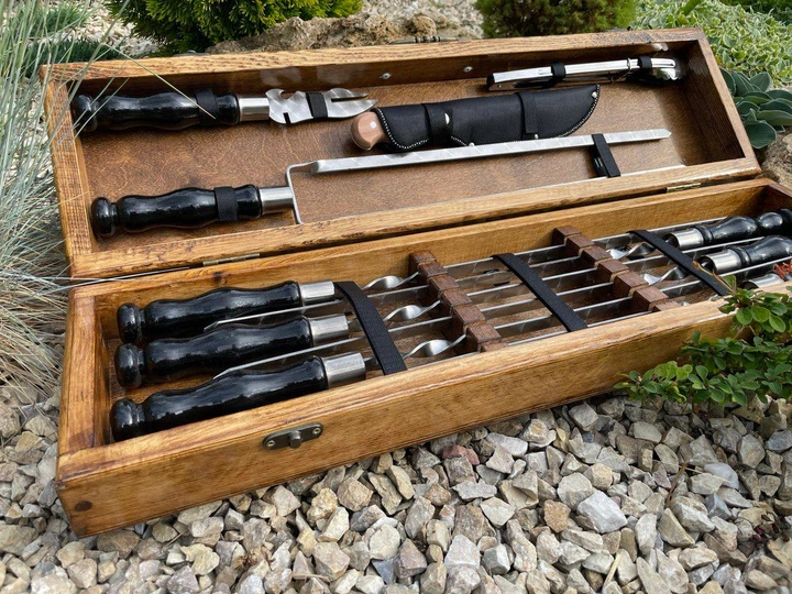 Набір із 6 шампурів для м'яса (600х10х3 мм) + комплект аксесуарів у дерев'яному кейсі Ш32