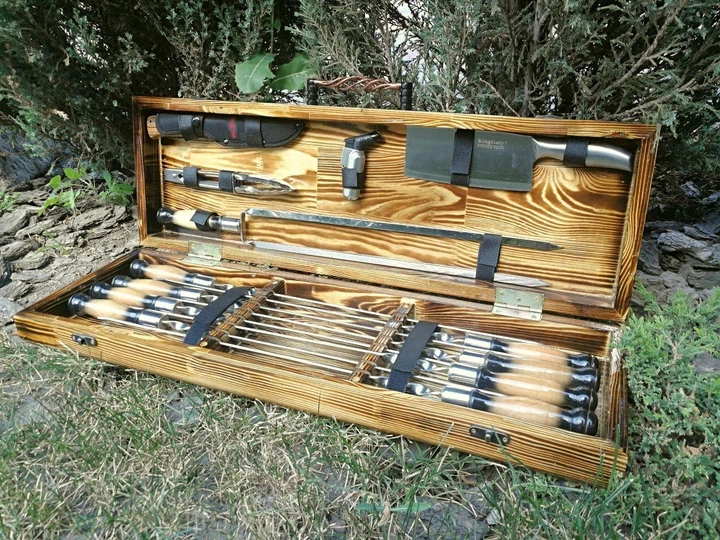 Подарунковий набір шампурів у дерев'яному кейсі Кемпінг Міні для пікніка ручна робота 19 предметів нержавіюча сталь (80-10-K