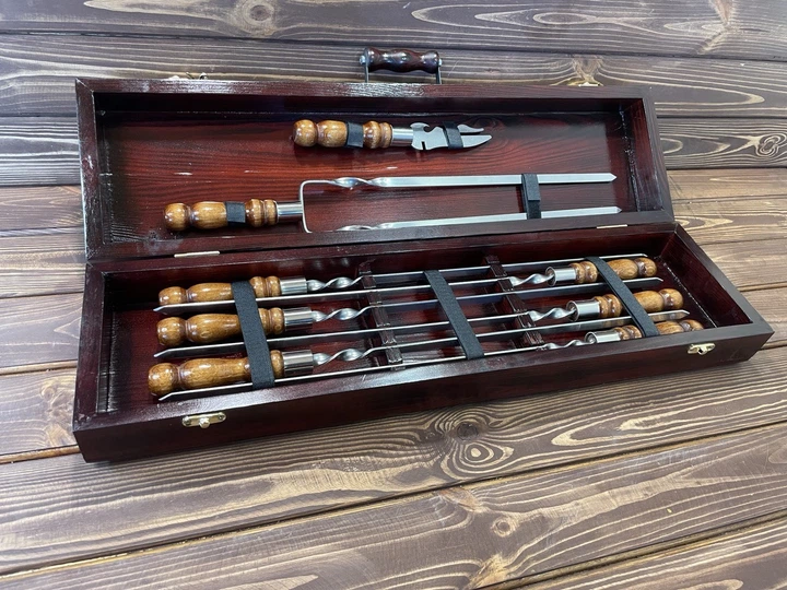 Набір із 6 розбірних шампурів для м'яса "Profi" (650х12х2,5 мм) + комплект аксесуарів у дерев'яному кейсі Ш23