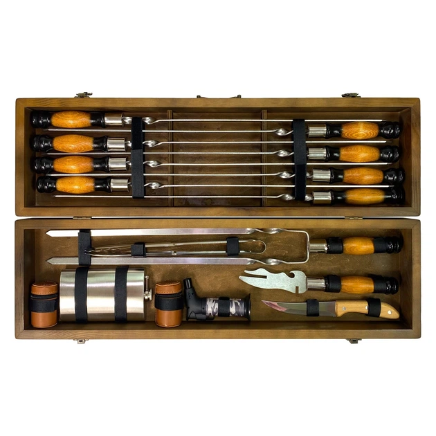 Подарунковий набір шампурів Трофей класик з нержавіючої сталі в дерев'яному кейсі 14 предметів Коричневий (127-10-KS-7402)