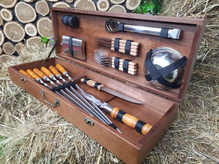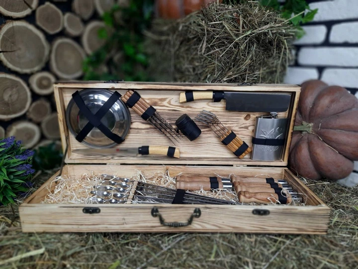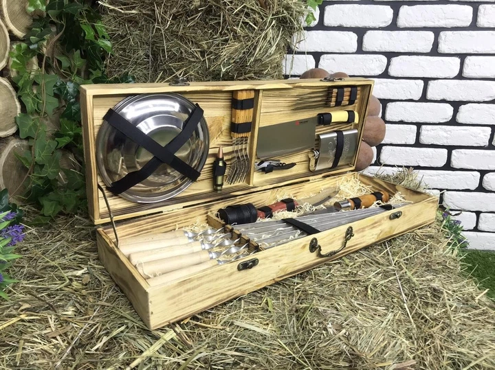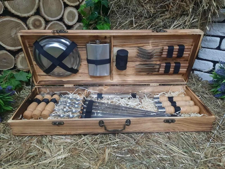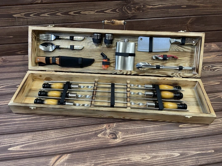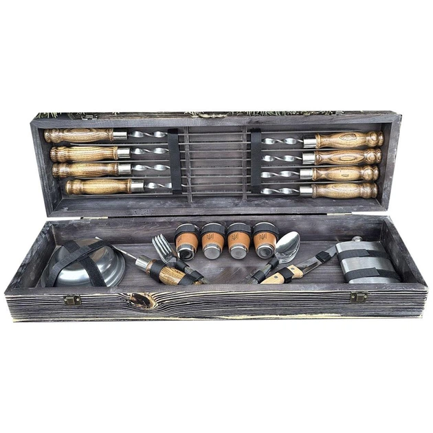Набір 6 шампурів 600х10х3 + набір аксесуарів у дерев'яному кейсі (650х23х10 мм) Ш45