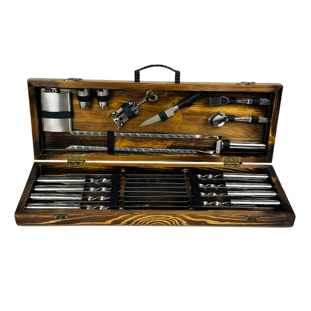 Подарунковий набір шампурів та аксесуарів Скіф классік із нержавіючої сталі 19 в 1 в дерев'яному кейсі (21-10-KS-7404)
