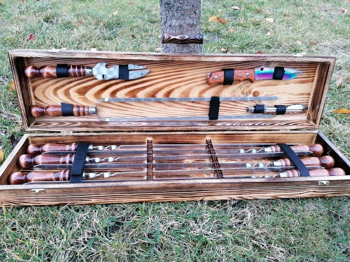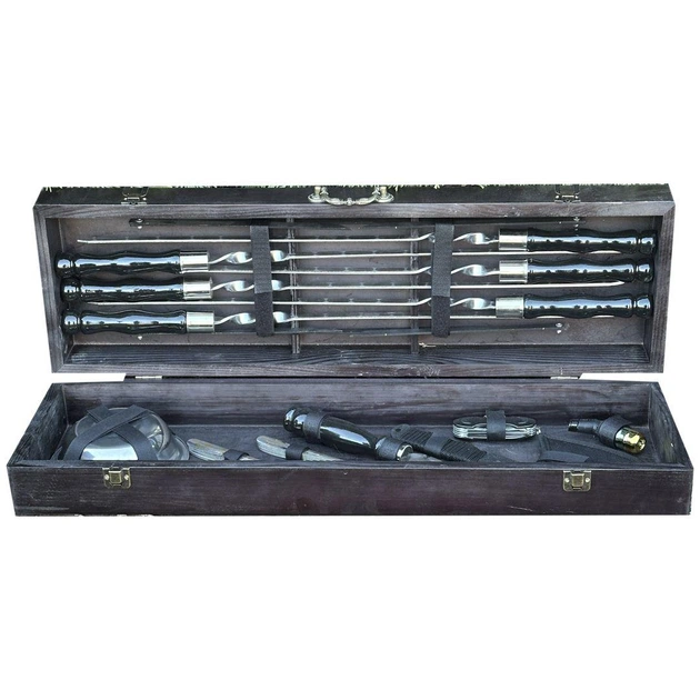 Набір із 6 шампурів для м'яса (600х10х3 мм) + комплект аксесуарів у дерев'яному кейсі Ш33