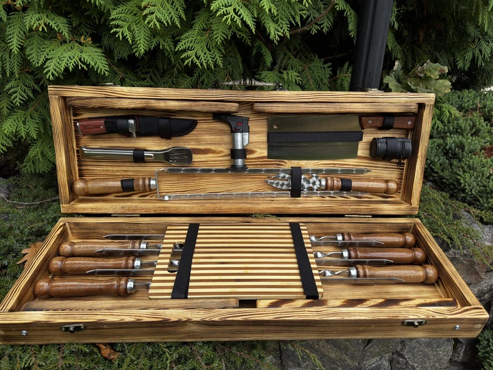 Подарунковий набір шампурів та приладдя для BBQ у дерев’яному кейсі-столі "Комфорт з шампурами з нержавіючої сталі Classic"