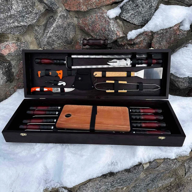 Набір шампурів та аксесуарів для пікніка Vela GRILLS G1 Темний Подарунковий шашличний набір 20 предметів з мангалом у дерев'