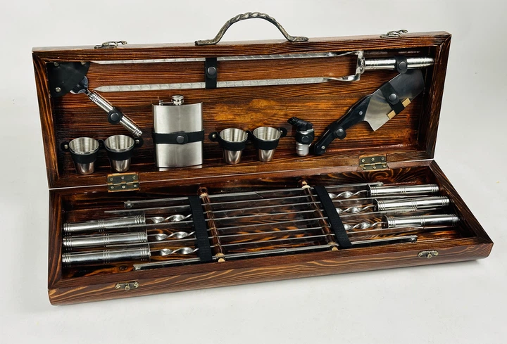 Набір із 6 шампурів для м'яса (630х12х3 мм) + комплект аксесуарів у дерев'яному кейсі l-209