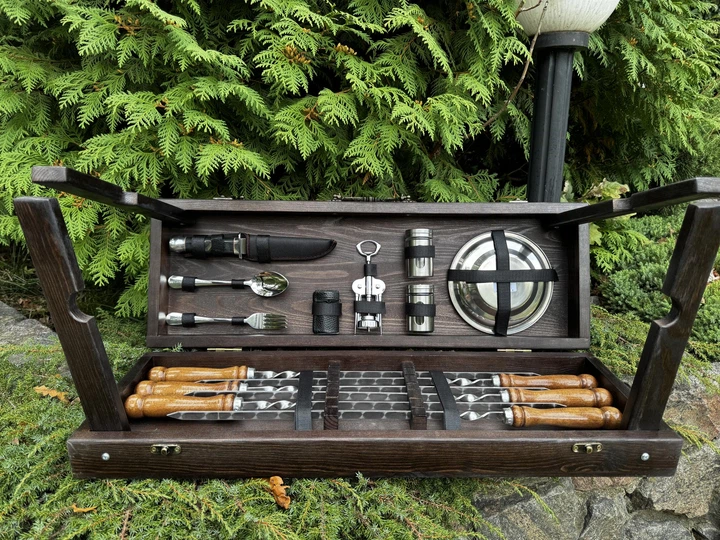 Набір шампурів з нержавіючої сталі та дерев'яними ручками у зручному кейсі-трансформері ( кейс-стіл ) "Похідний з шампурами
