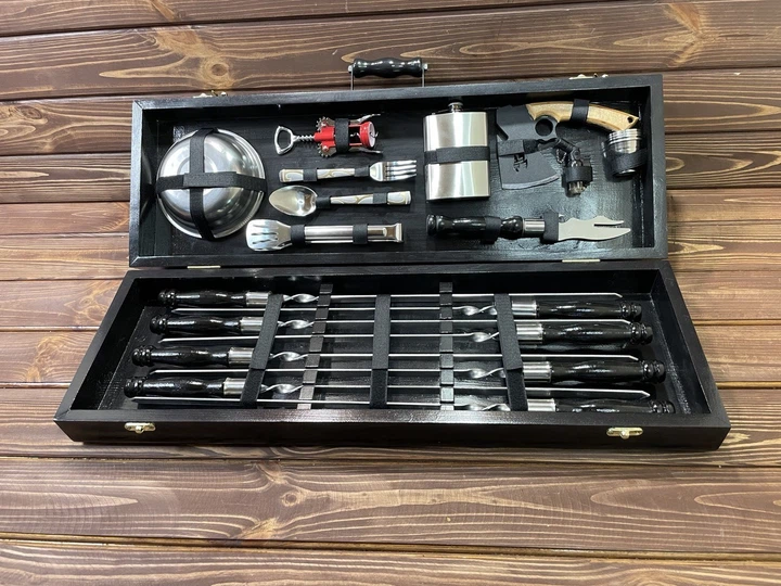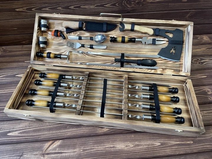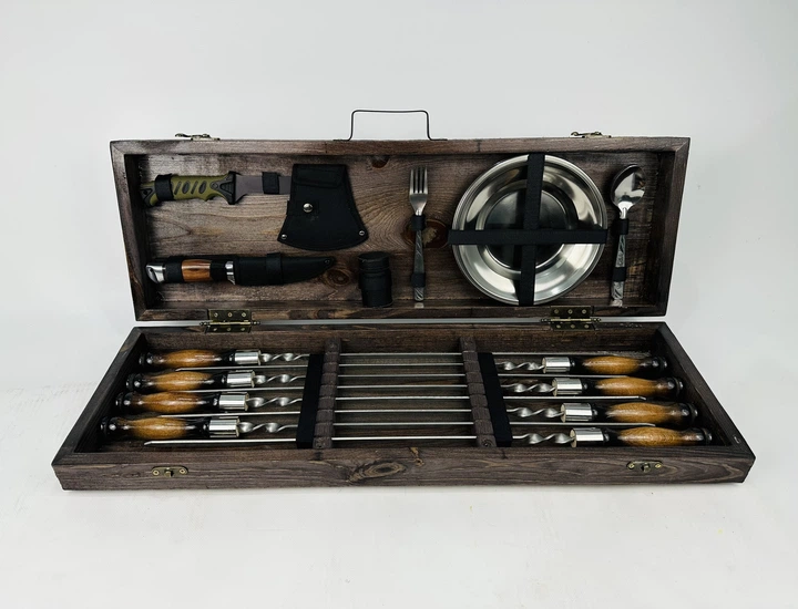 Набір шампурів у дерев'яному кейсі ручної роботи BBQ LUX 2 75x24x10 см 26 предметів з нержавіючої сталі (125-10-KS-7813)