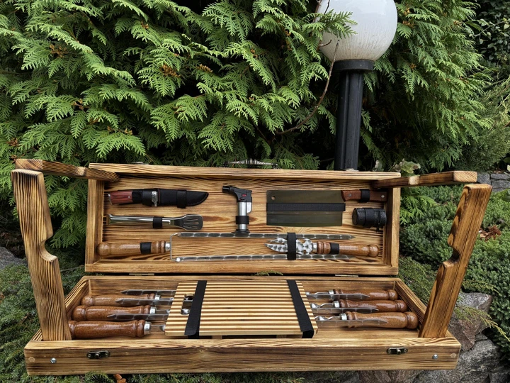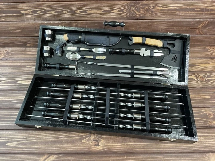 Подарунковий набір шампурів та приладдя для BBQ у дерев’яному кейсі-столі "Комфорт з шампурами з нержавіючої сталі Black"