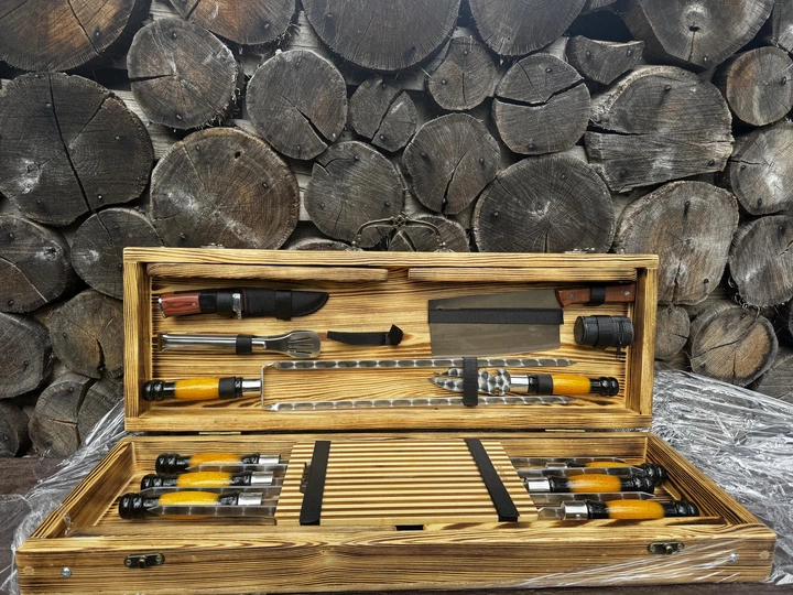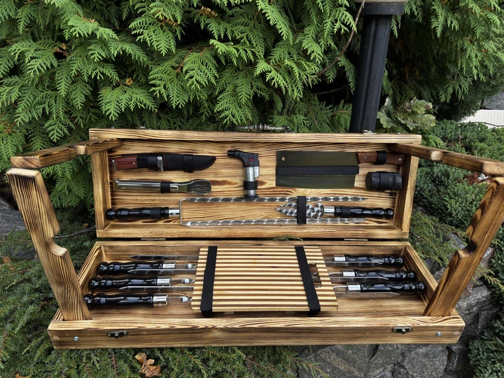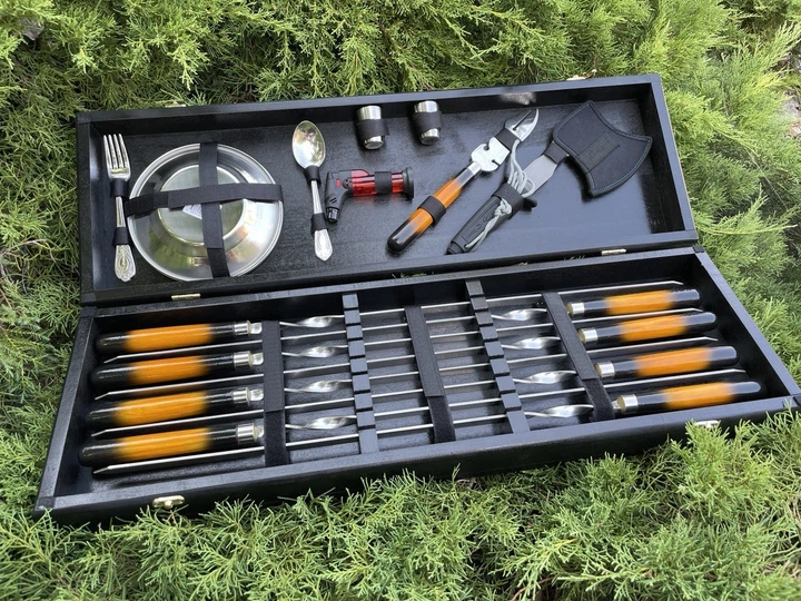 Набір шампурів у кейсі з дерева Робінзон 74x20x14 см 25 предметів з нержавіючої сталі (125-10-KS-7704)