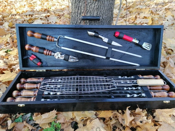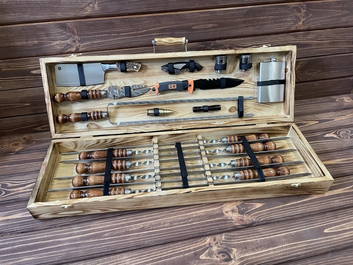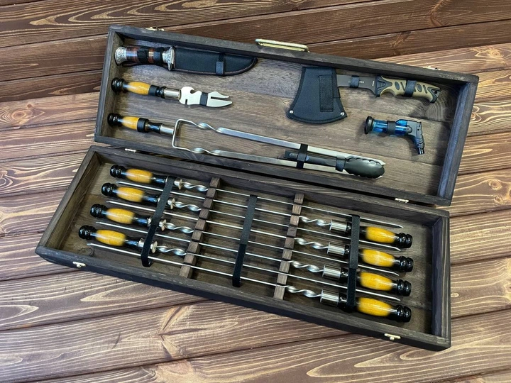 Набір шампурів для шашлику в дерев'яний кейс на подарунок чоловікові