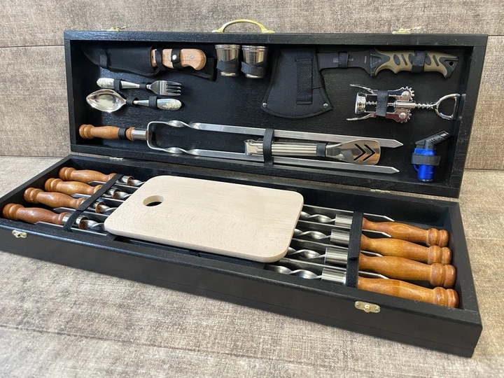 Набір із 6 шампурів для м'яса (600х10х3 мм) + комплект аксесуарів у дерев'яному кейсі k-009