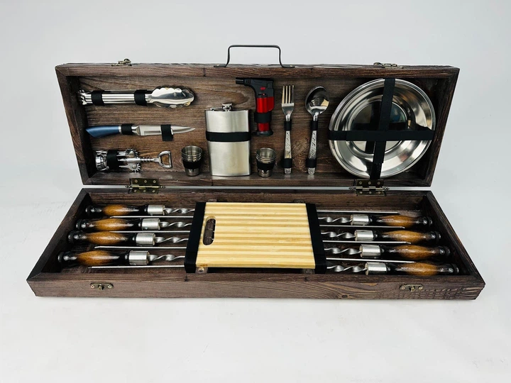 Подарунковий набір шампурів і аксесуарів Сталевий з нержавіючої сталі в дерев'яному кейсі ручної роботи 30 предметів Коричне