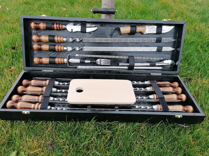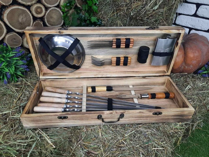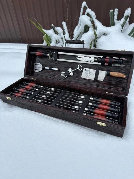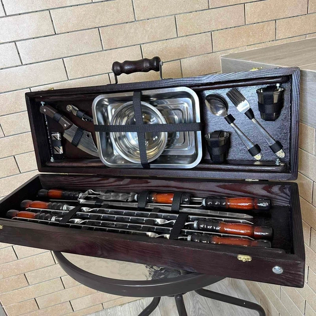 Набір із 6 шампурів для м'яса (600х10х3 мм) + комплект аксесуарів у дерев'яному кейсі Ш49