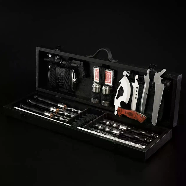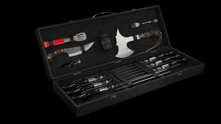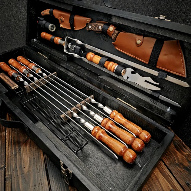 Набір шампурів у дерев'яному кейсі ручної роботи BBQ LUX 75x24x10 см 31 предмет з нержавіючої сталі (125-10-KS-7807)