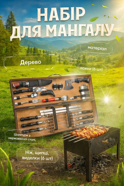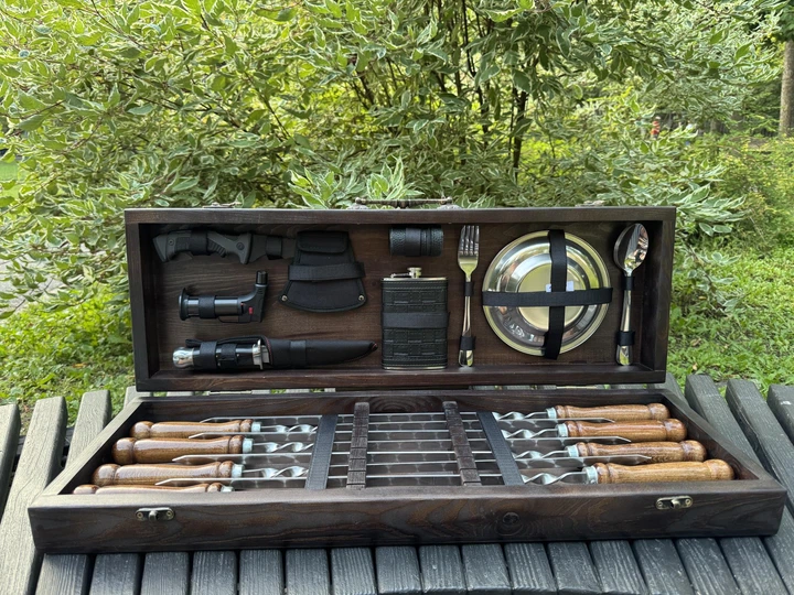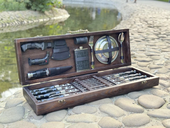Подарунковий набір шампурів та аксесуарів ручної роботи у дерев'яному кейсі преміальної якості "Турист з шампурами Classic"