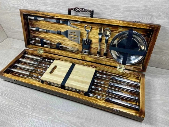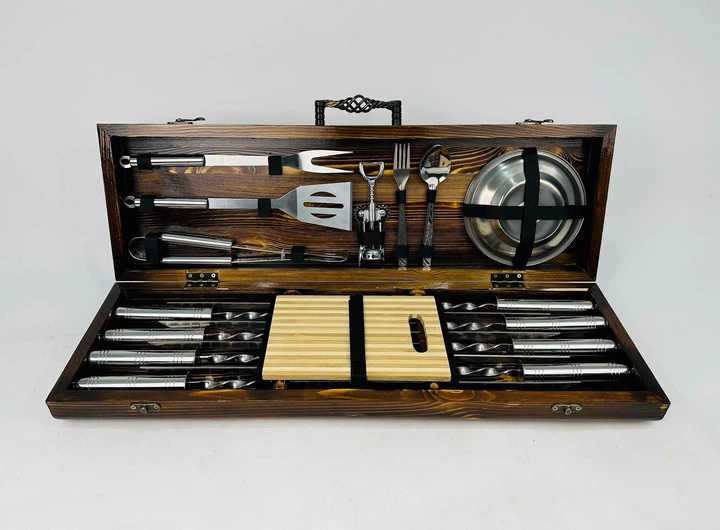 Подарунковий набір шампурів та аксесуарів ручної роботи у дерев'яному кейсі преміальної якості "Турист з шампурами Black" 28