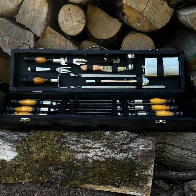 Подарунковий набір для шашлику Скаут з нержавіючої сталі в дерев'яному кейсі-трансформері шампури з аксесуарами 32 предмети