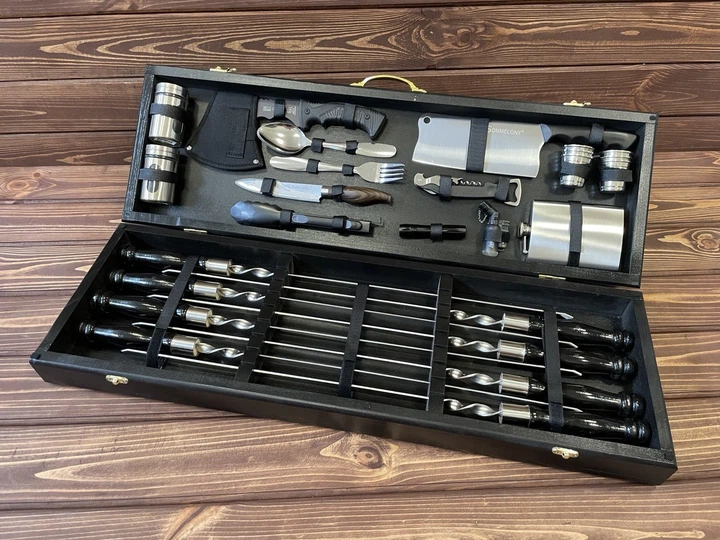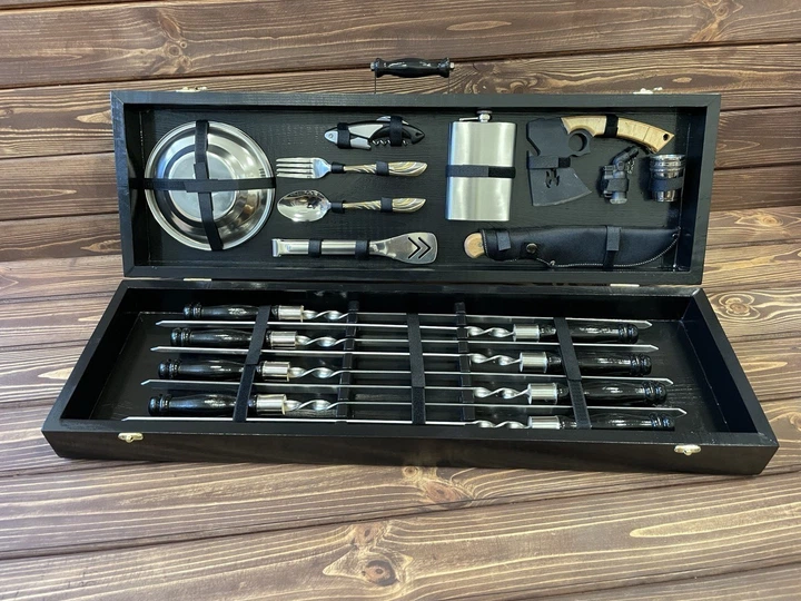 Набір шампурів і аксесуарів Мисливець для пікніка з нержавіючої сталі в кейсі з натурального дерева 19 предметів (80-10-KS-7