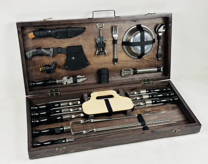 Набір шампурів і аксесуарів Скаут з нержавіючої сталі в дерев'яному кейсі зі столом трансформером (80-10-KS-7620)