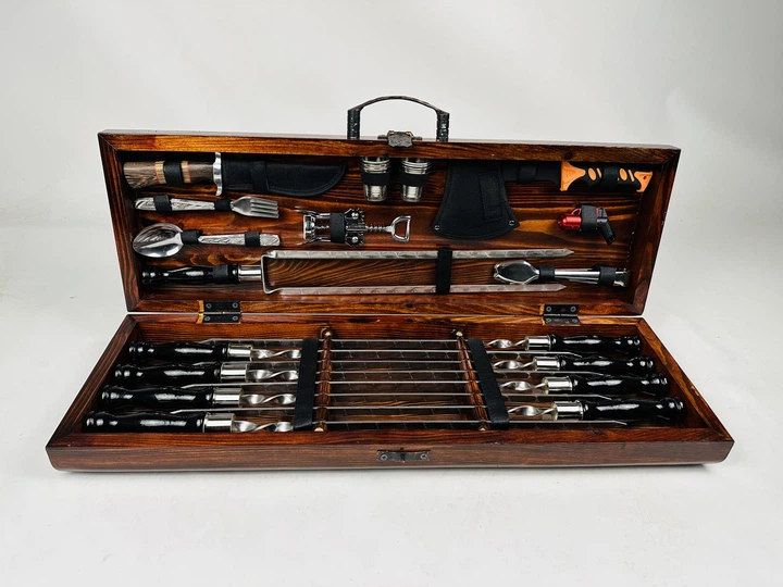 Набір 6 шампурів 660х12х2,5 + набір аксесуарів в дерев' яному кейсі Ш25