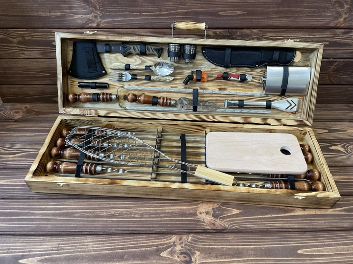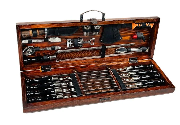 Набір шампурів у дерев'яному кейсі ручної роботи Гриль LUX 75x24x10 см 32 предмета з нержавіючої сталі (125-10-KS-7801)