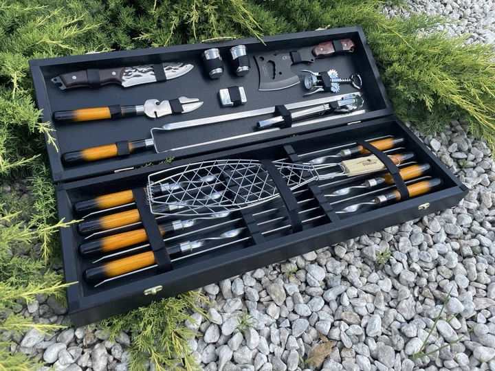 Набір шампурів у дерев'яному кейсі Гриль Lux нержавіюча сталь 36 предметів ручна робота (80-10-KS-7801)