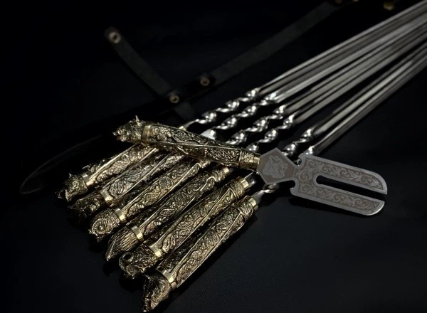 Набір шампурів Шерхан з нержавіючої сталі з дерев'яними ручками ручної роботи в дерев'яному кейсі (33-89-НШ-Ш22)