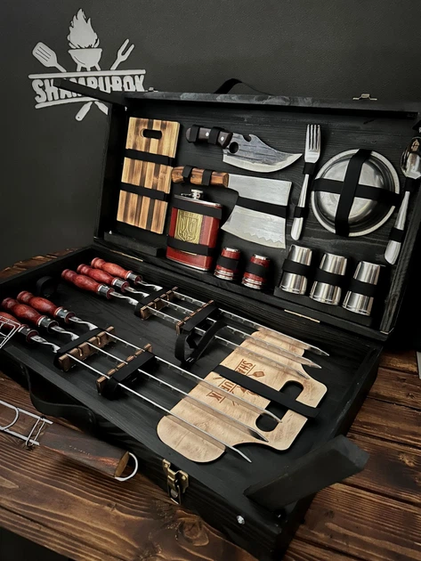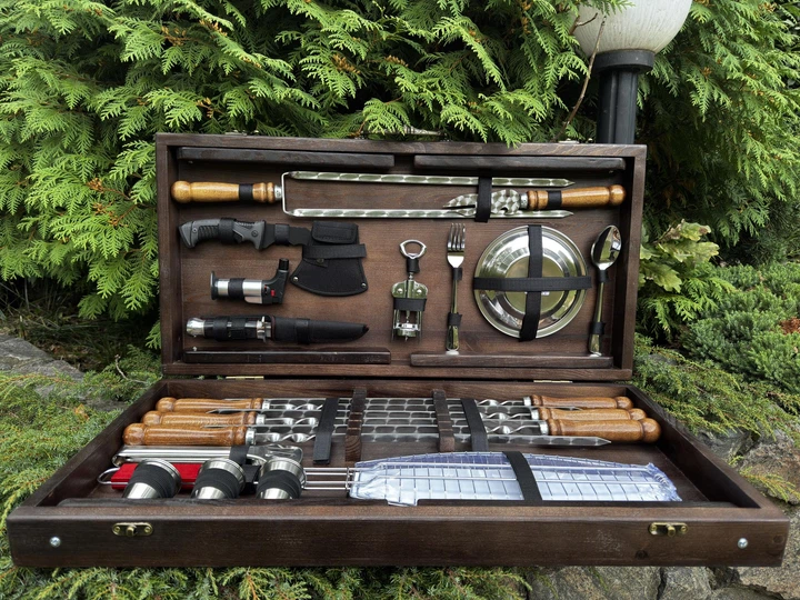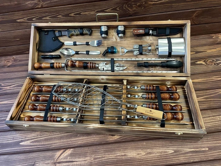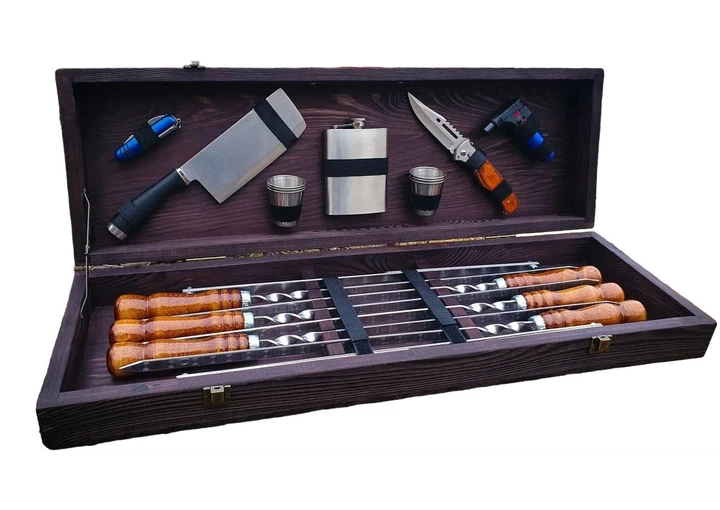 Набір шампурів і аксесуарів для барбекю в дерев'яному кейсі, ручна робота, фляга з чарками, подарунковий набір шампурів для