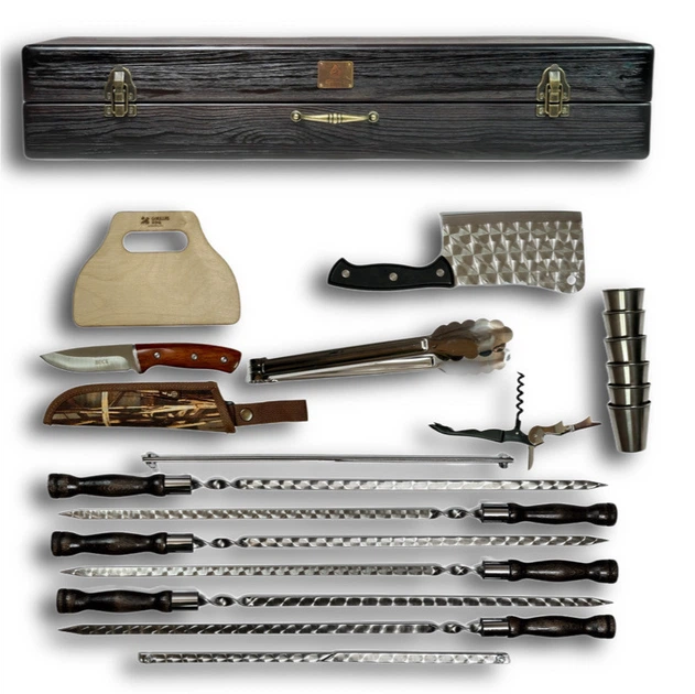 Набір із 6 шампурів для м'яса (600х10х3 мм) + комплект аксесуарів у дерев'яному кейсі k-013