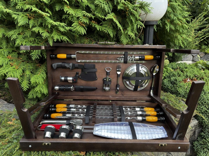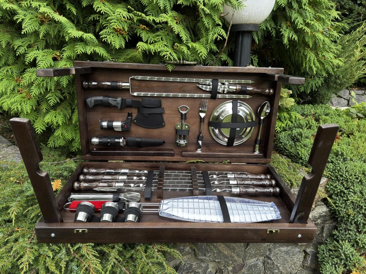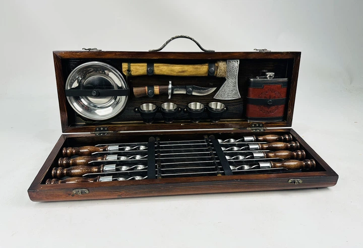 Подарунковий шашличний набір шампурів та аксесуарів для BBQ в дерев’яному кейсі-трансформері ( розкладається в компактний ст